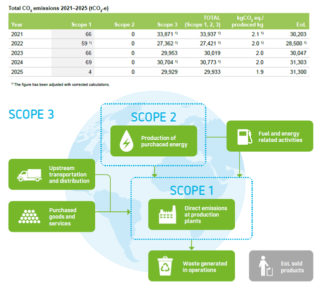 As almost all our remaining emissions originate from the raw materials (Scope 3), we focus our efforts on increasing the share of recycled and renewable raw materials in our production. Key drivers enabling us to move towards our goal are launch of products made of recycled raw materials, development of plastic recycling and recycling technology, new sources of raw materials, and innovations.